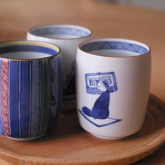 私達、上出長右衛門窯(かみでちょうえもんがま)が70年描き続けている「笛吹(ふえふき)」の湯呑。堅苦しくない自由な絵柄は使う人に話題を提供します。