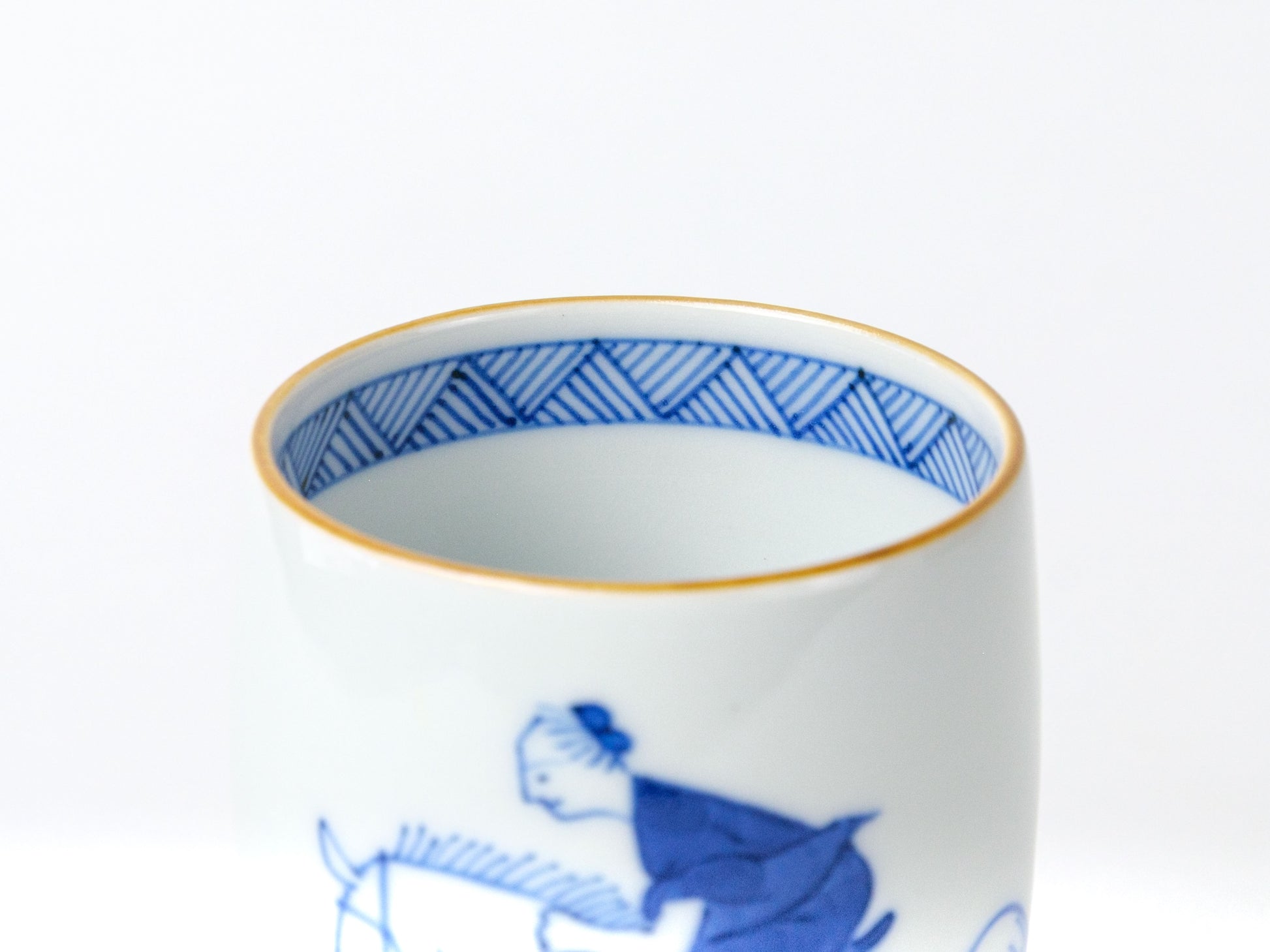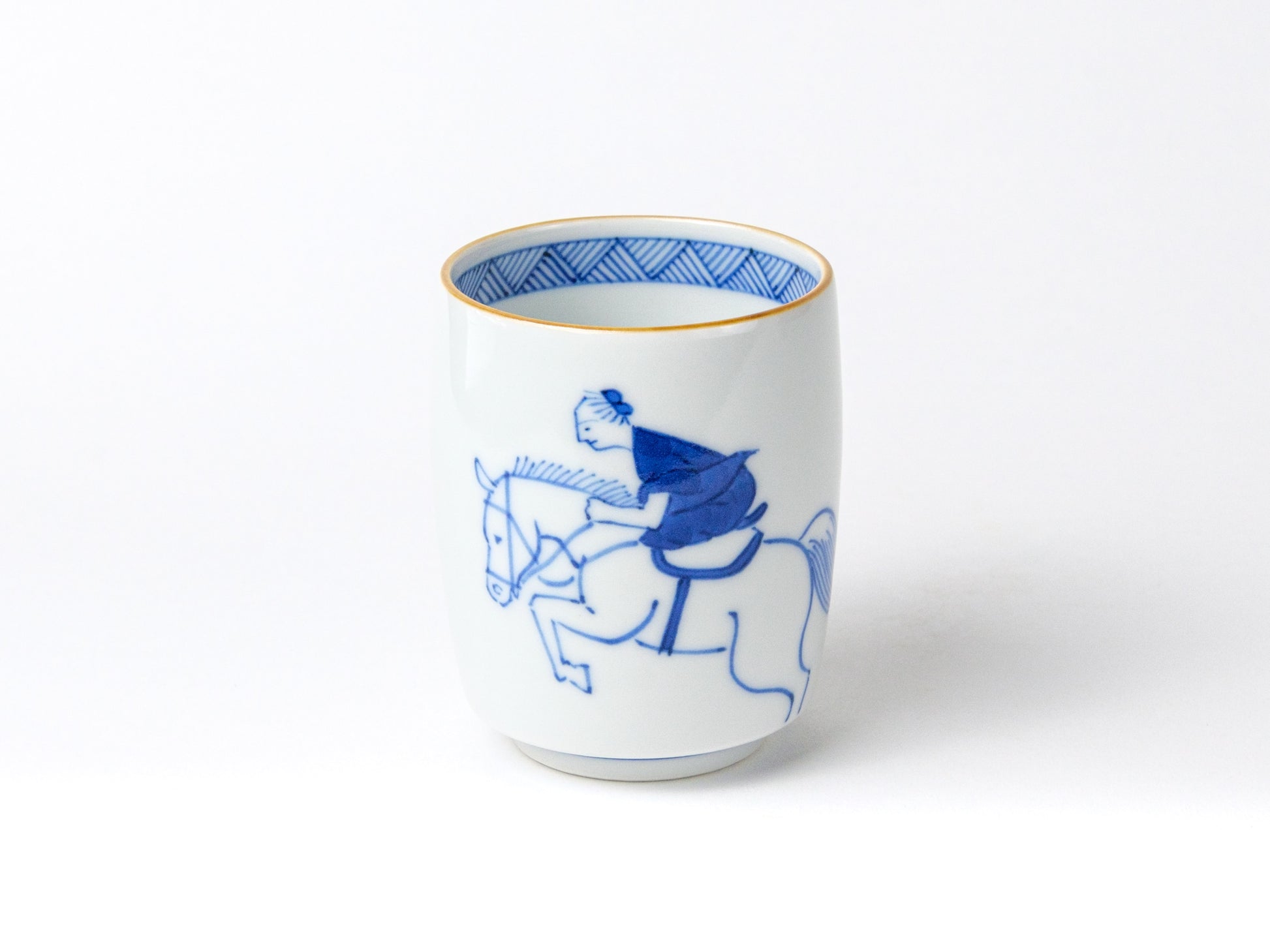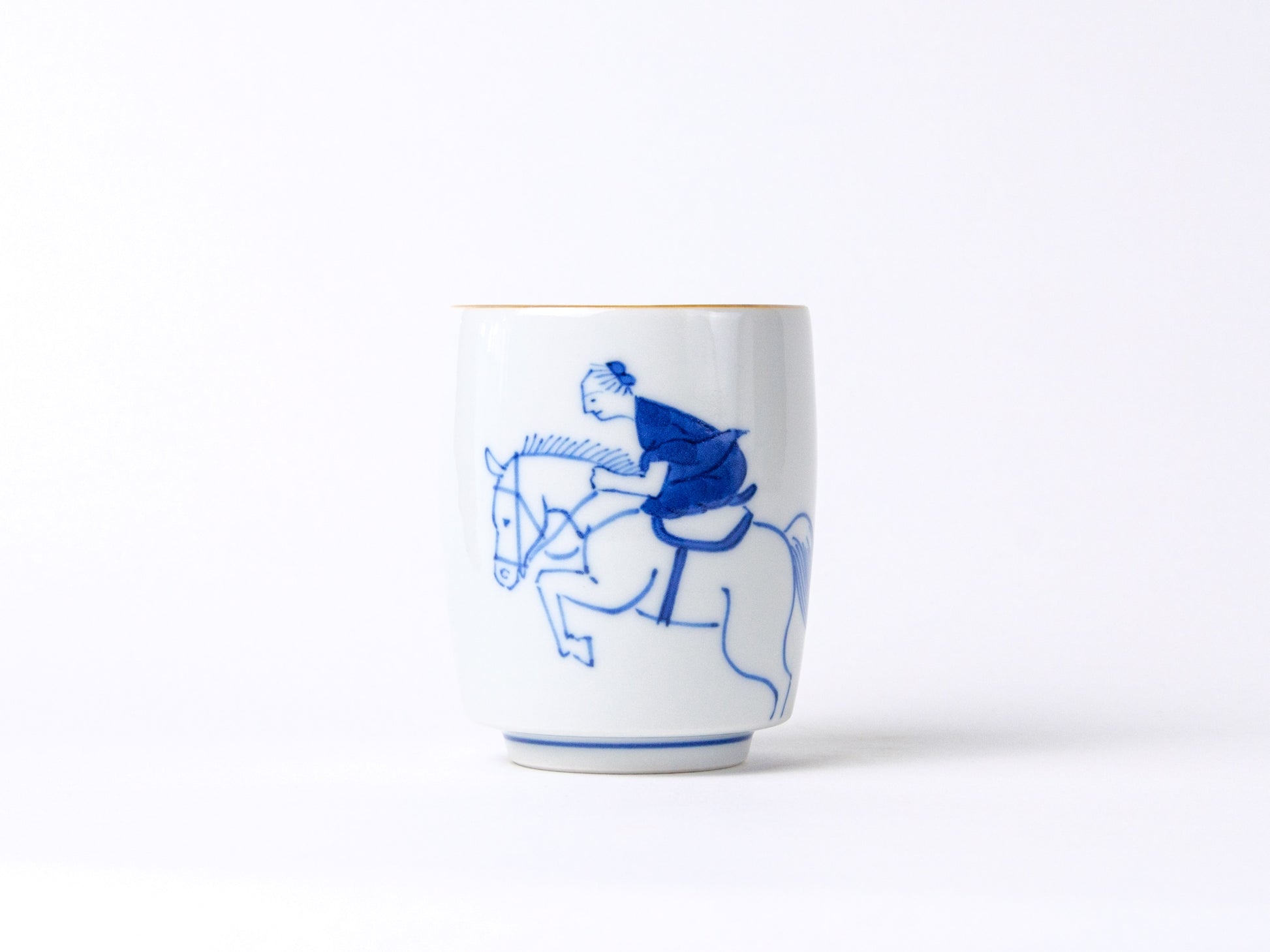 毎年干支に因んで製作している限定笛吹です。今年は湯呑からはみ出すほどダイナミックに馬術に興じる笛吹の姿を描きました。笛吹は上出長右衛門窯 の遊び心の原点です。