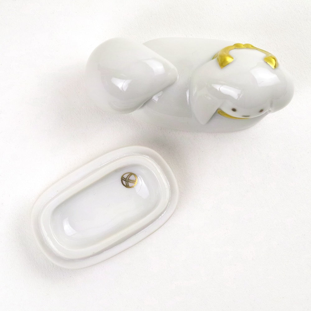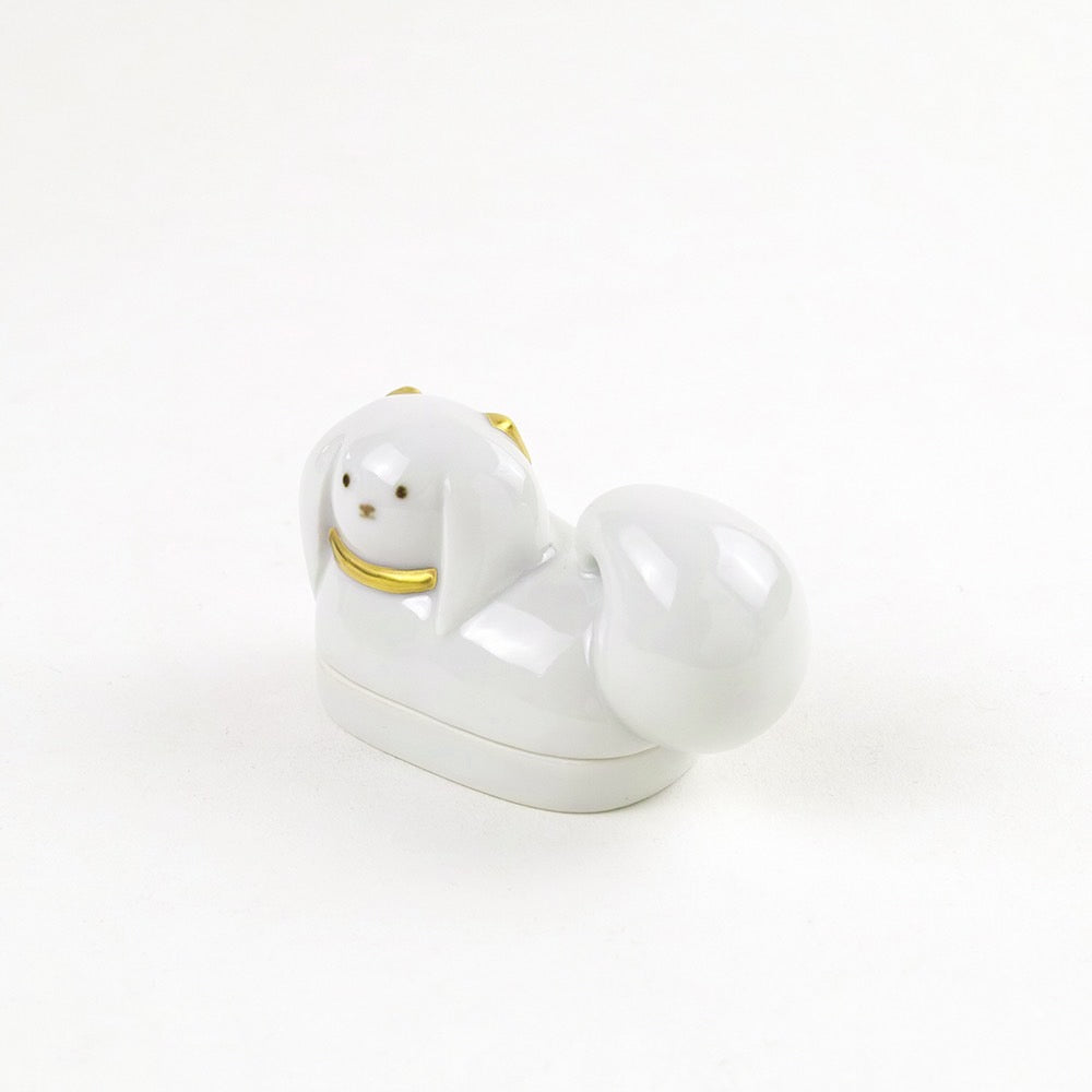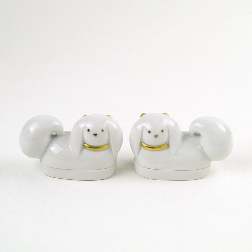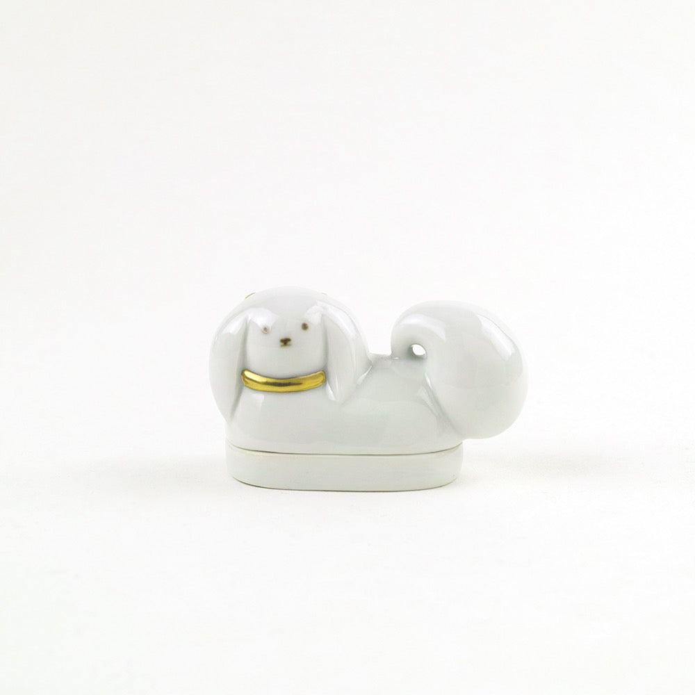 御伽犬とは犬筥(いぬばこ)とも言い、古くより雛人形の調度品として親王の左右に飾られました。左右一対で厄除けとし、子供の健やかな成長と幸せを願いました。また犬はお産が軽く、たくさんの仔を産むことから安産守りとしても飾られたそうです。