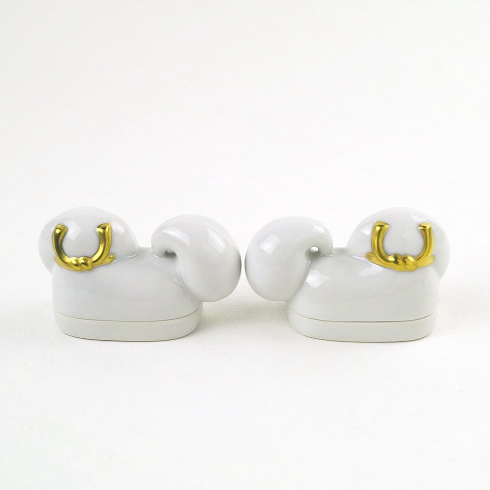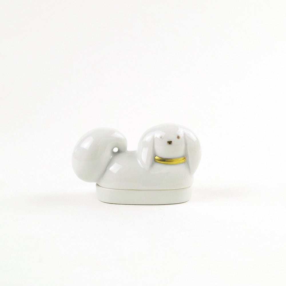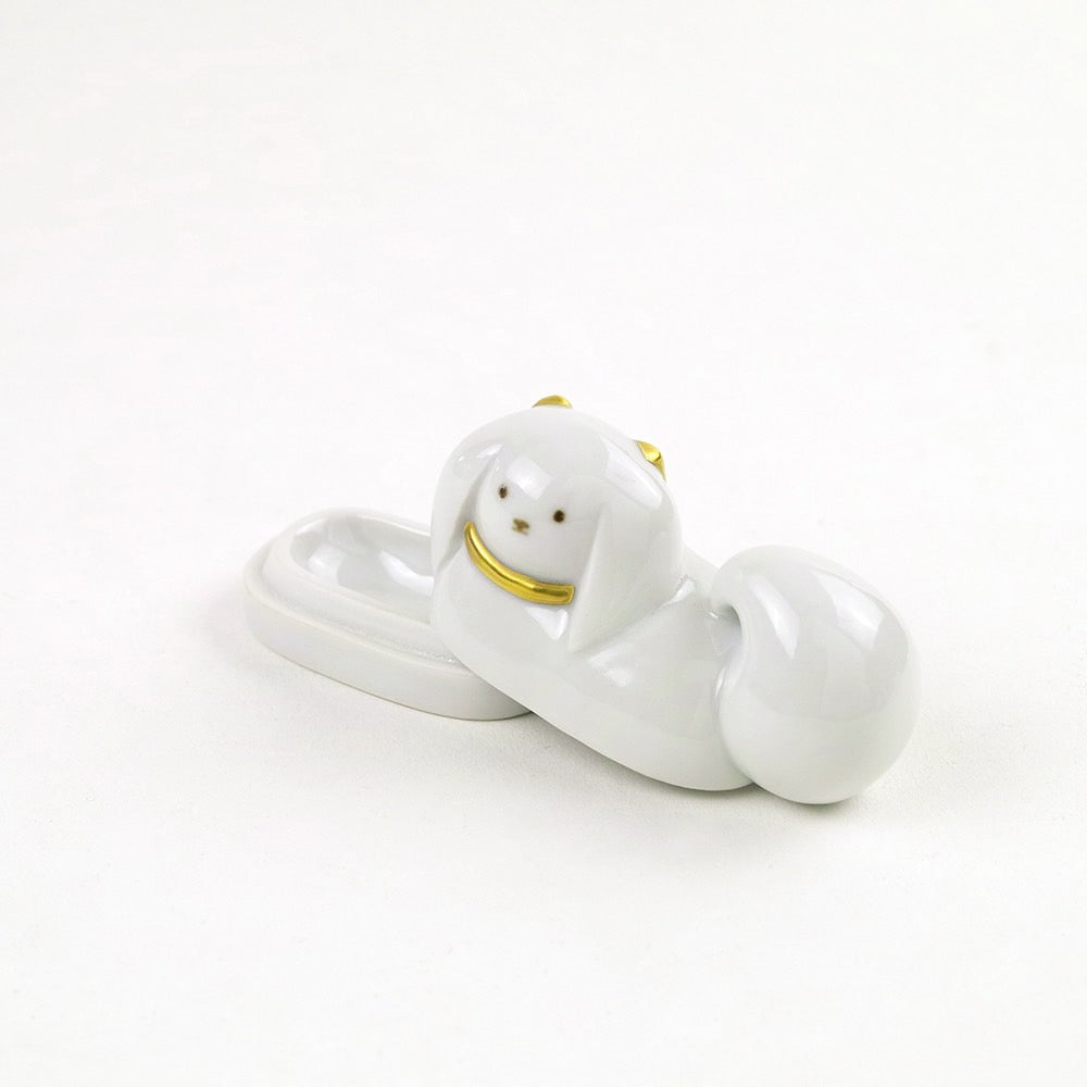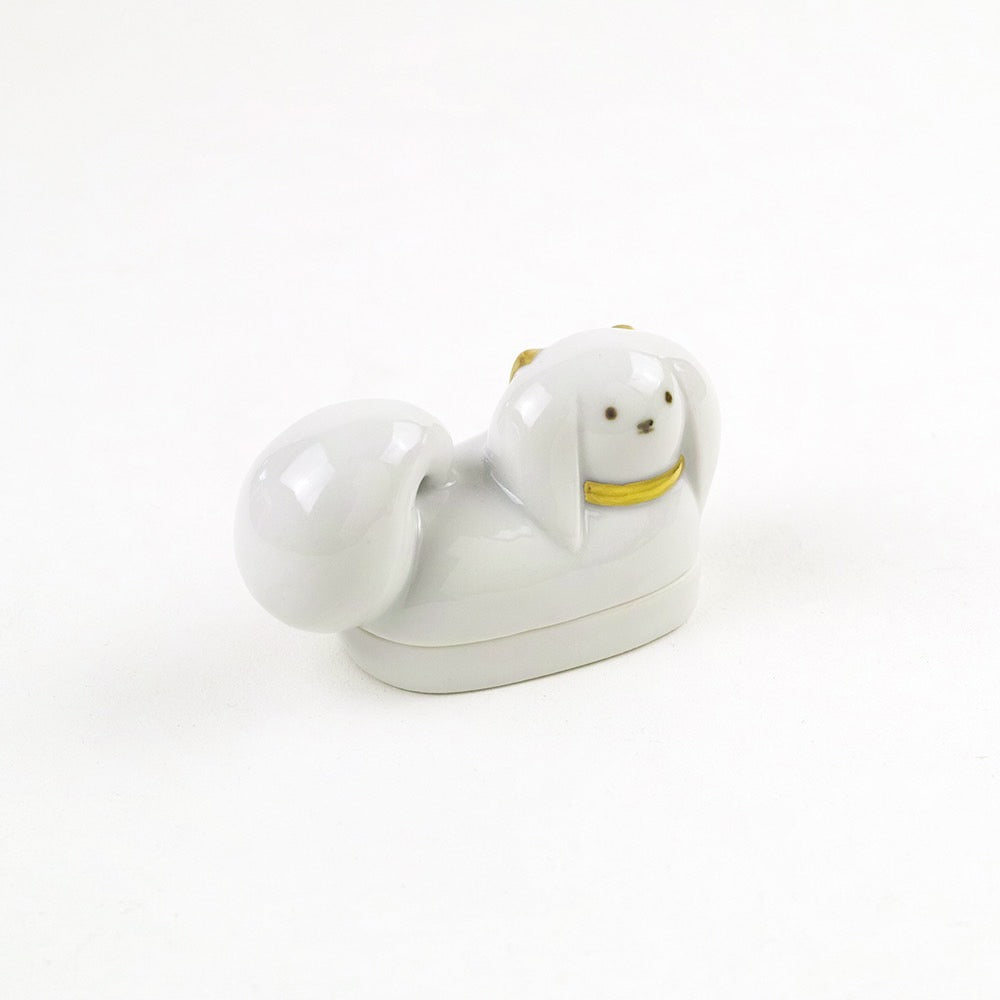 御伽犬とは犬筥(いぬばこ)とも言い、古くより雛人形の調度品として親王の左右に飾られました。左右一対で厄除けとし、子供の健やかな成長と幸せを願いました。また犬はお産が軽く、たくさんの仔を産むことから安産守りとしても飾られたそうです。